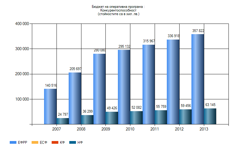 | Година | Бюджет * | Договорени ** | Плащания | | 2007 | 165 312 592 | 0 | 0 | | 2008 | 241 996 315 | 18 973 369 | 172 802 | | 2009 | 329 505 969 | 900 878 940 | 8 931 918 | | 2010 | 347 213 689 | 902 380 083 | 432 629 663 | | 2011 | 371 725 807 | 1 137 439 153 | 87 703 307 | | 2012 | 396 374 702 | 1 565 804 502 | 449 188 633 | | 2013 | 420 966 968 | 2 025 894 505 | 333 706 139 | | 2014 | 0 | 2 208 682 343 | 455 557 766 | | 2015 | 0 | 2 213 998 914 | 392 525 651 | | Общо | 2 273 096 041 | - | 2 160 415 879 |
